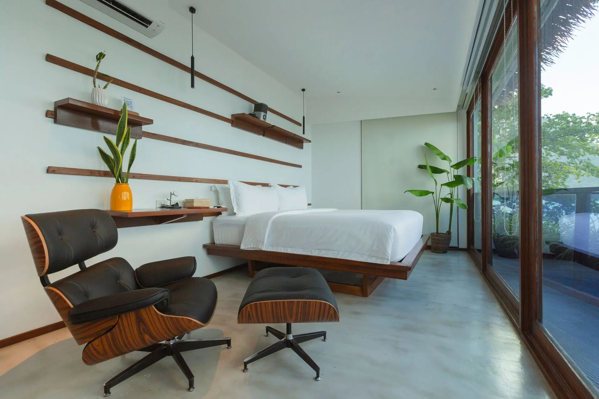 Steps from the beach, Sunset Villa offers a private pool, in-room projector, and an Eames sofa chair — designed for couples who want their evenings to feel like something worth remembering.